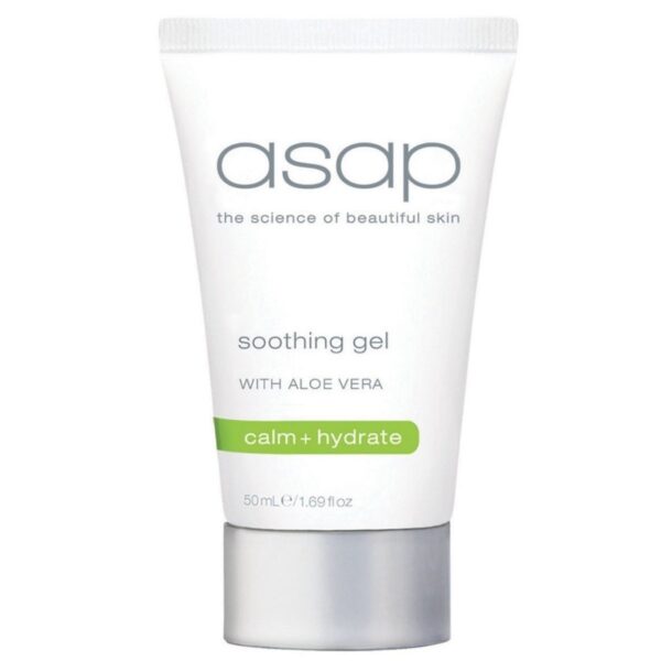 ASAP Soothing Gel with natural ingredients Aloe Vera, Pepper Berry, Sage and White Tea soothes redness and calms the skin and is ideal to use following microdermabrasion, IPL, laser treatments, waxing and shaving.